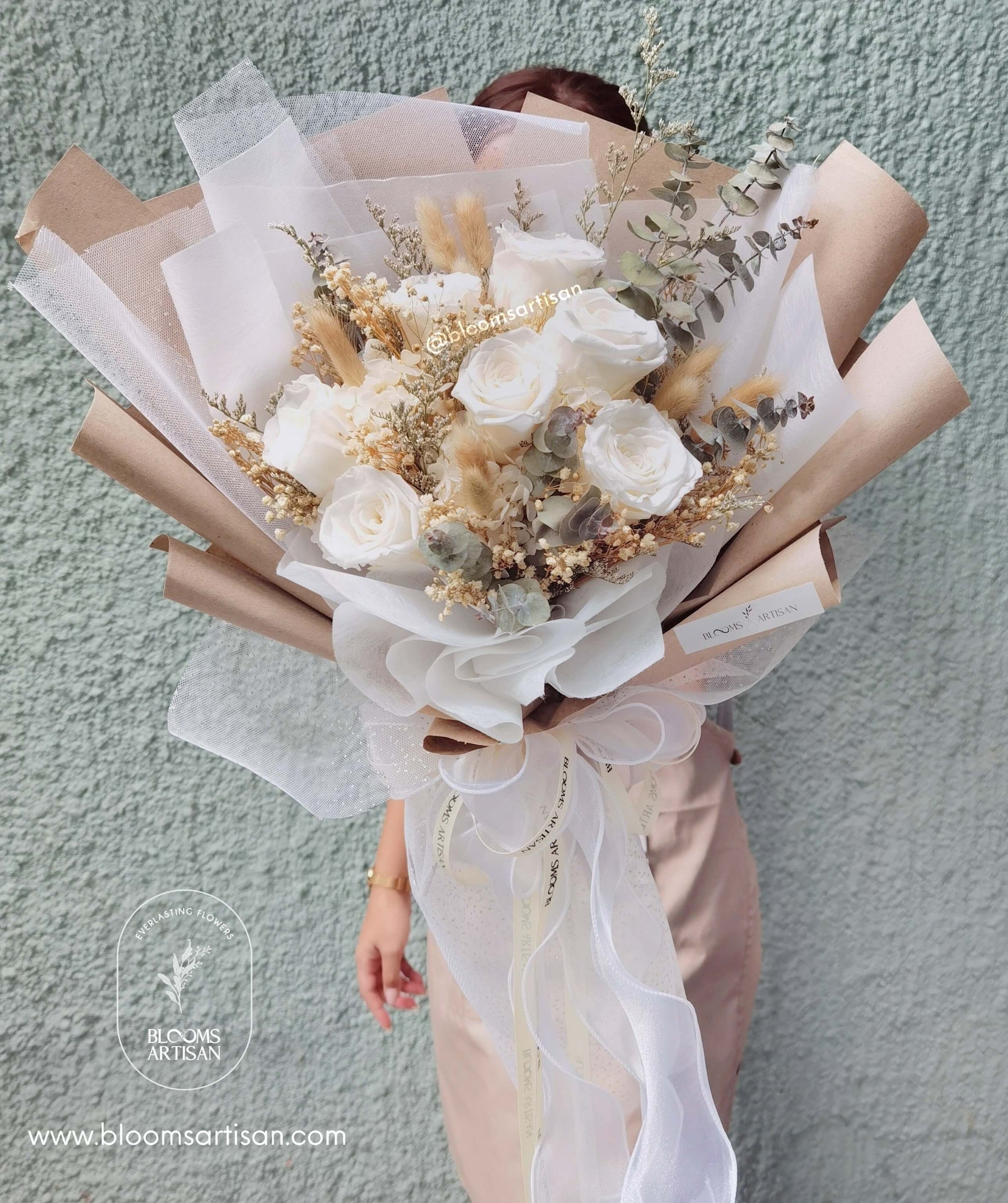 Bigger version of our Latte bouquet is composed of seven preserved roses and dried blooms that could last for 2 to 3 years if properly taken care of.
